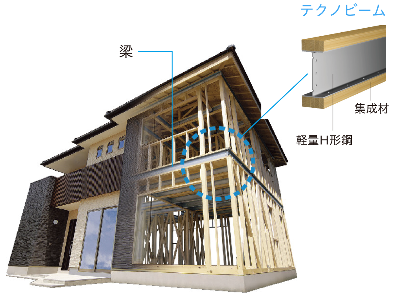 そこで私たちは、家を支える大切な梁に、木と鉄を組み合わせた「テクノビーム」を採用。