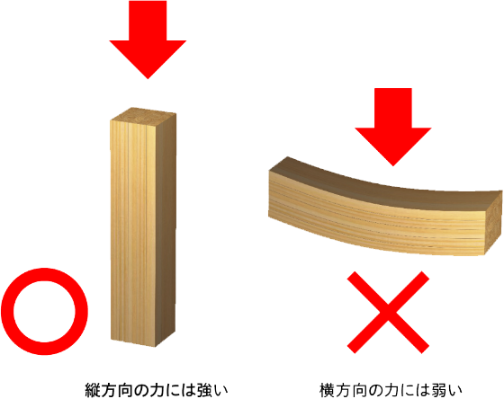 木は、柱のように縦向きに使う場合は十分な強度が期待できますが、梁のように横向きに使う場合、強度が不足しがちになるといった弱点があります。また長期間荷重がかかると、重さでたわみが発生するのも注意すべき点です。