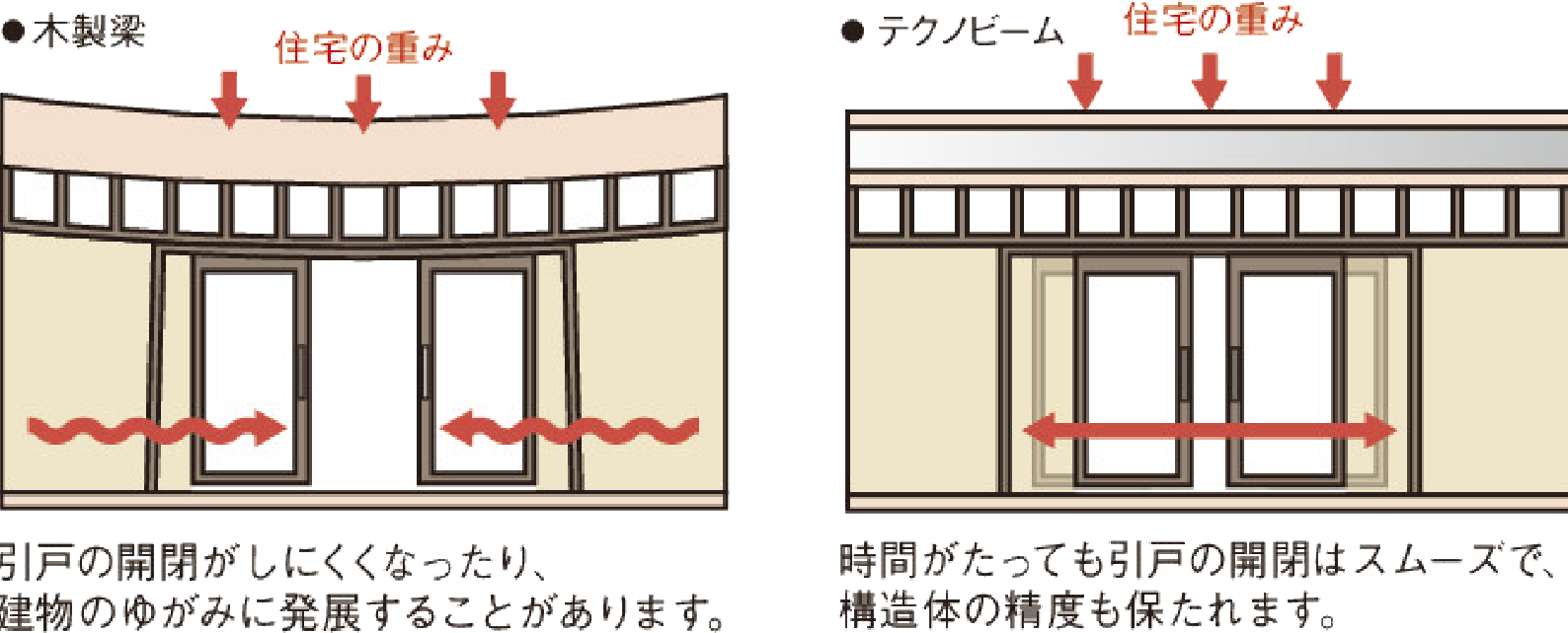 木の梁は、長い年月重さを支え続けることで「クリープ変形」と呼ばれるたわみが少しずつ進行します。これが原因で、引き戸の開閉がしづらくなるなど、暮らしに不具合が出ることもあります。テクノビームは鉄骨を芯材としているため、クリープ変形がほとんど進行せず、同じ条件で比べると、30年後のたわみ量は木製梁の4分の1以下。長く暮らしても、家の美しさと使いやすさを保ち続けます。