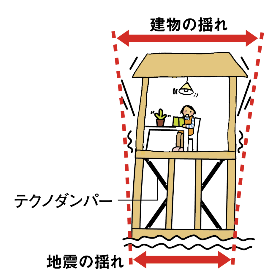 テクノストラクチャーの制震システムは、建物の骨組みに制震装置「テクノダンパー」を組み込むことで、地震の力を吸収し、建物の揺れを抑制。建物の2階、3階部分の揺れを抑えます。