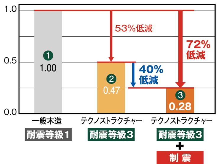 - 一般木造住宅を耐震等級1相当、テクノストラクチャーを等級3とした場合。