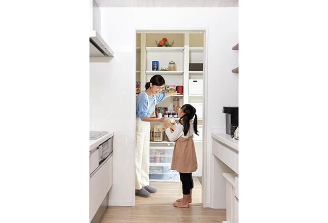 まとめ買いした食料品を収納できるパントリーや、2階には家族全員の普段着を収納できる
