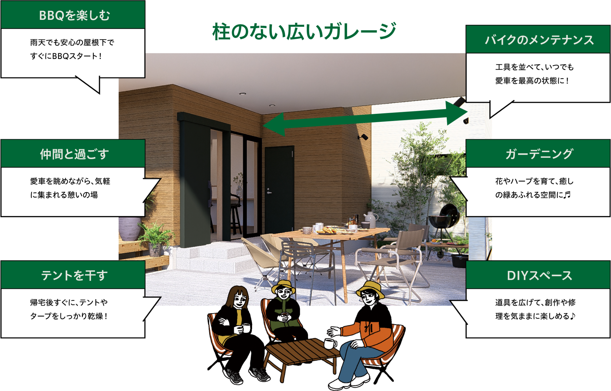 広いガレージだからできる家族や友人とのBQや、愛車のメンテナンスを家で楽しむ。