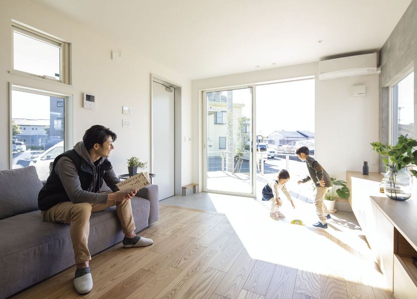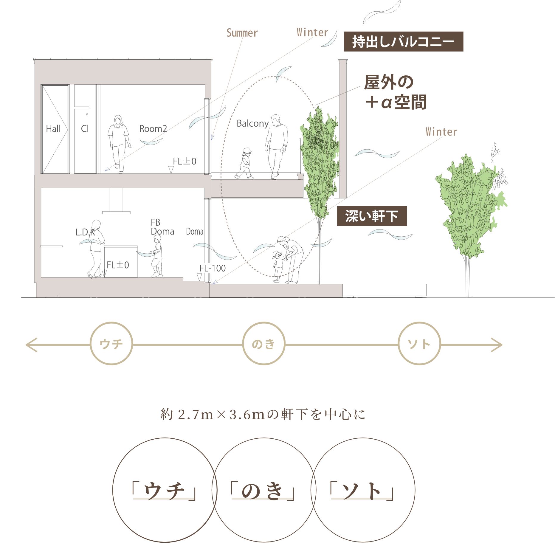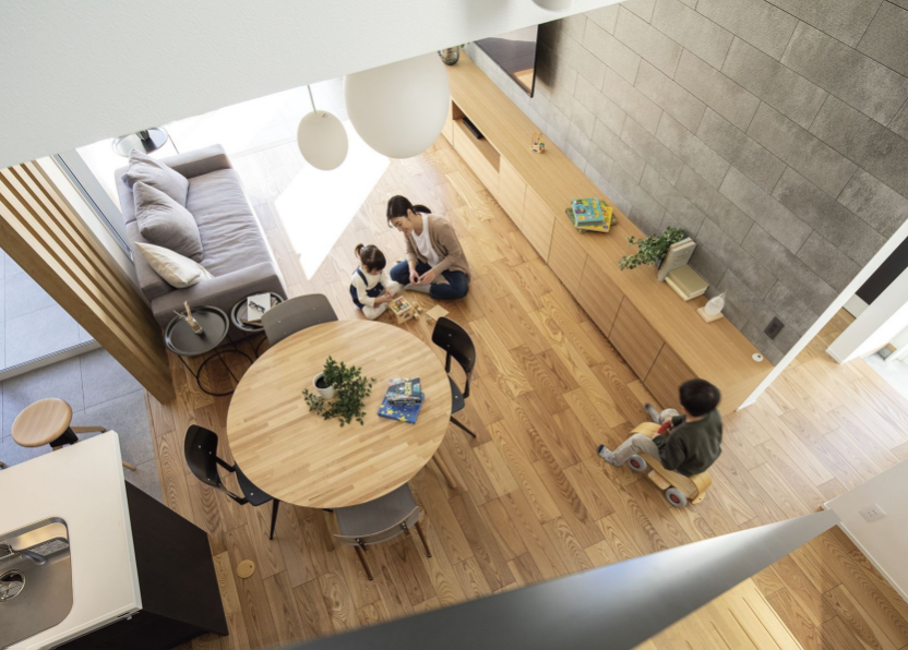 リビング、土間、ウッドデッキという「ウチ」から「ソト」へのつながり。縛らず、のびのび。子ども達の遊び心を空間が解き放ちます。