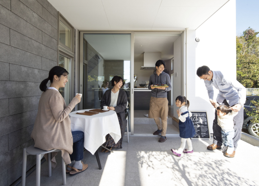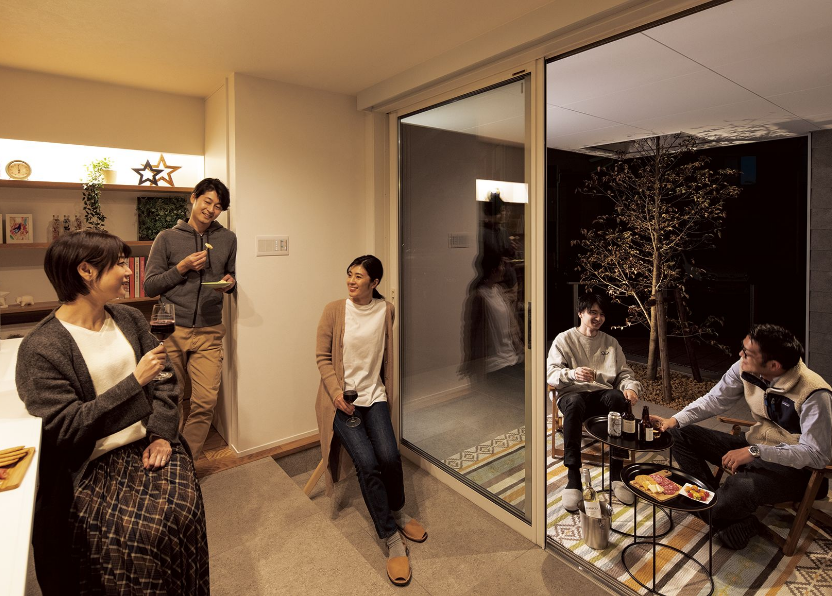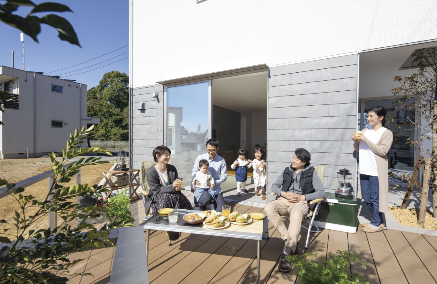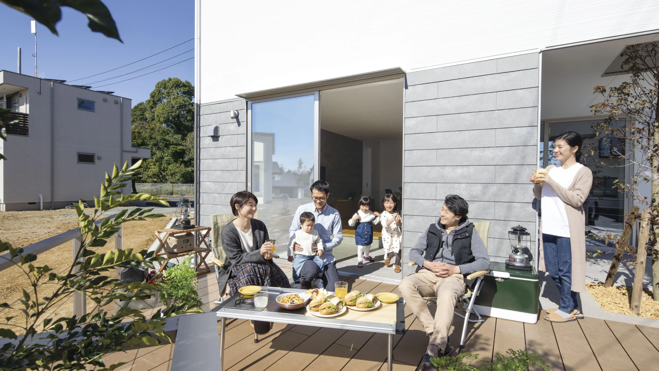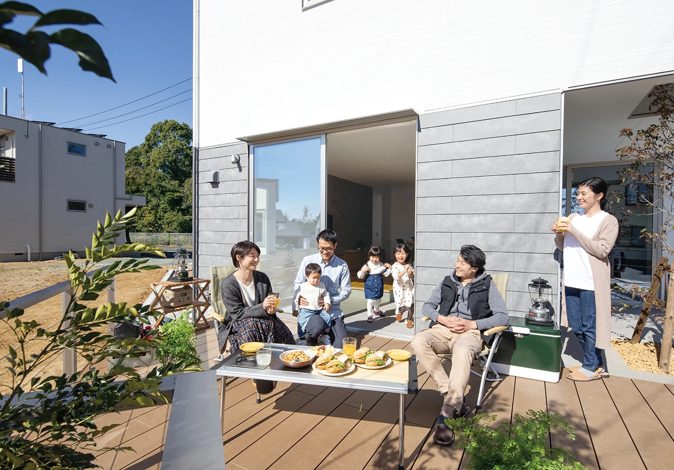 - 広い軒下とリビングで友人を招いてホームパーティ