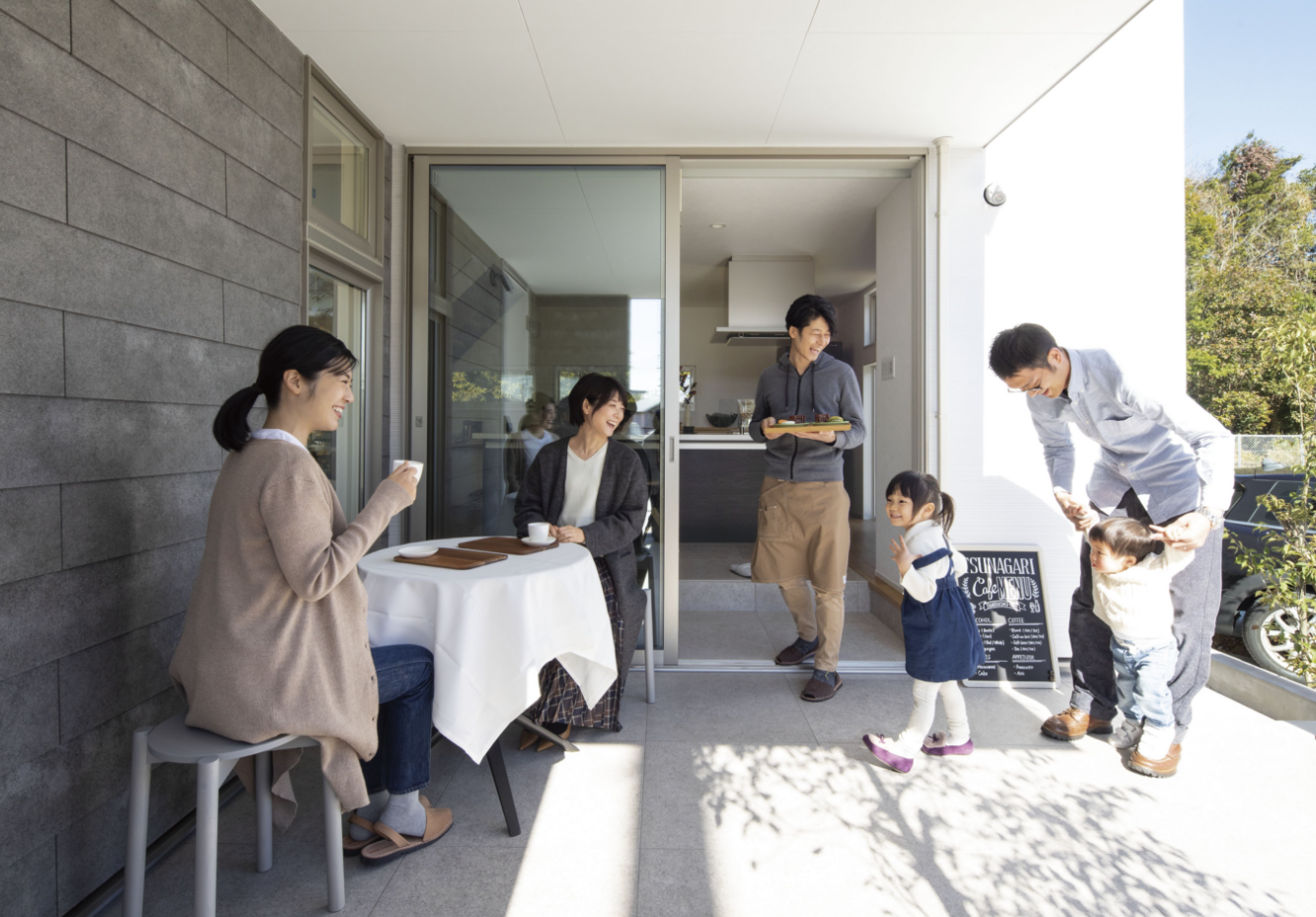 キッチンからつながる軒下空間でオープンカフェを。友人を招いて淹れたてのコーヒーとつくり立てのスイーツでおいしくおもてなし。