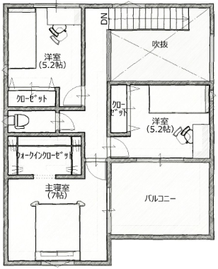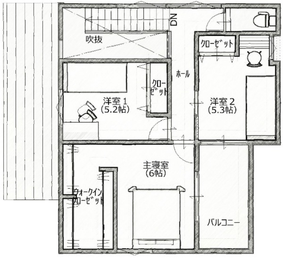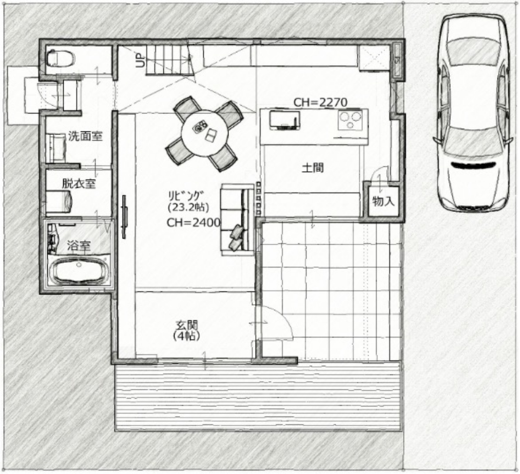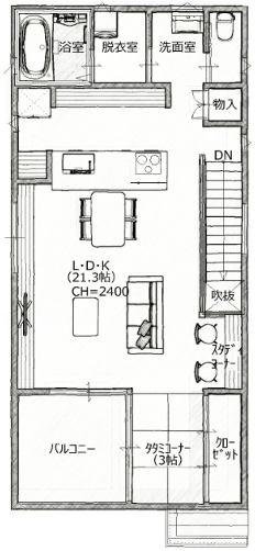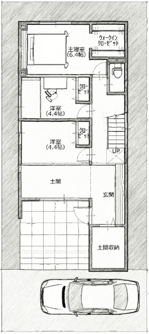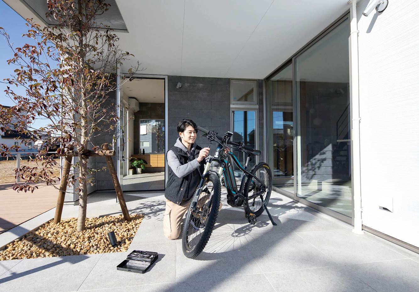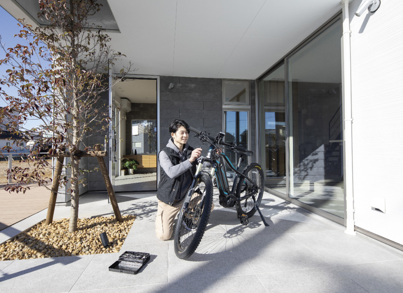 広い軒下空間とつながる土間だから、汚れを気にせずに自転車の整備や、パーツ交換等ができます。土間とつながる洋室は、家族の変化に合わせて個室にすることもできます。