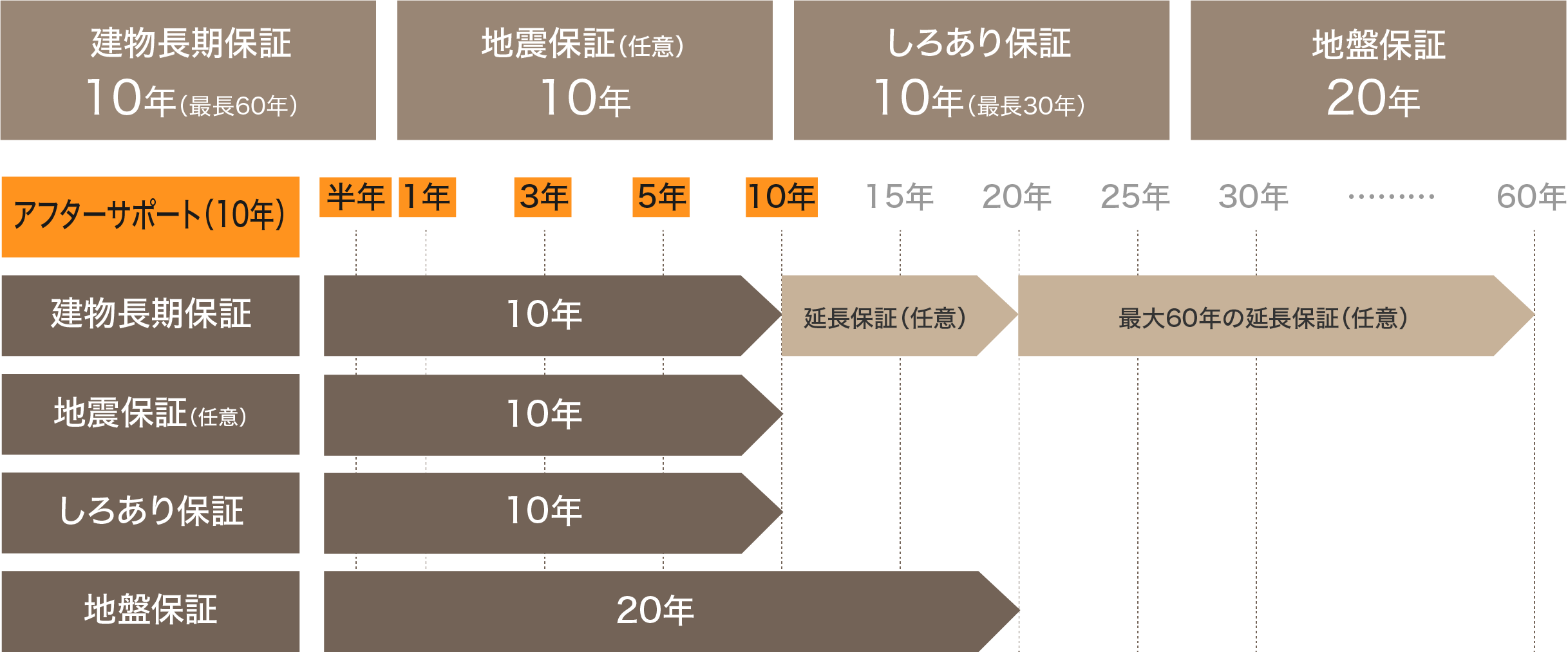 - 初期保証10年の保証期間に加え、任意で10年を追加、最長で60年まで延長可能です。これにより、高性能な住宅で安心して長期間暮らしていただけるようサポートします。